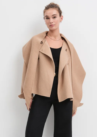 Double-faced wool, double-breasted front, swingy shape, and a detachable scarf that feels like a built-in accessory.