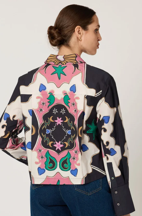 This long-sleeve cropped button-down top features a classic collar, extended cuffs, and an artful print
